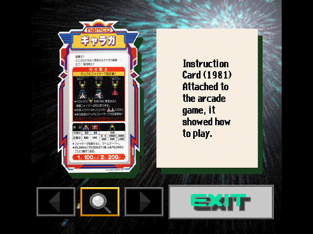 This first volume consists of Pac-Man, Rally-X, Pole Position, Bosconian, Galaga, and Toy Pop. Bosconian and Toy Pop are the obscure ones, the former an eight-way overhead shooter with some gnarly voice synthesis and the latter a cutesy maze game featuring killer wind-up toys. Toy Pop is the only real dud here, and the museum is overall nicely detailed and fairly clean looking for such an early PS1 title, with plenty of crunchy scans of memorabilia and posters to peek at.