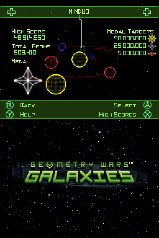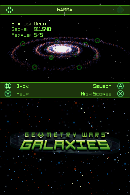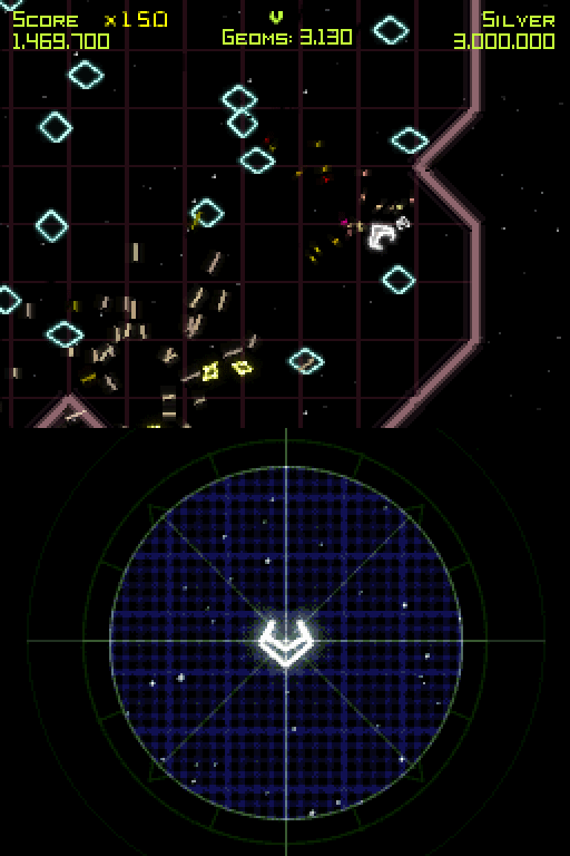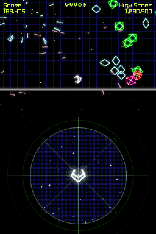 Galaxies tries to inject a campaign into the experience with mixed results. Levels are separated into planets that introduce gravity wells, strange level layouts, and tinker with your lives and smartbomb counts. Defeating enemies gives you "geoms" that add to your multiplier (up to 150x) and act as currency for new planets. Each planet has three score goals, though this is either annoyingly difficult to manage on one life or boringly easy to blow past 50,000,000 on. You have a helper droid you can upgrade as well, but all told, none of it makes things all that much more addicting.
