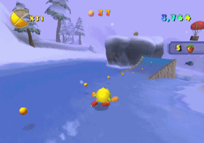Assuming you're playing the nicer version, however, what you'll find is a decently well-built, zippy (like 5-6 hours to complete) 3D platformer that takes Pac-Man through foggy forests, snowy mountains, volcanoes, and even down in a submarine for a beat. The snow portion of the game is the best, for one level and one level alone--Blade Mountain. Yes, friends, Pac-Man ice skates, and the speed is exhilarating and the level design lets you glide around with the grace of a violent swan. It's a shame only that one level comes anywhere close to memorable greatness, and the rest is just alright. Cute. Often frustrating. I'd recommend 3 over it.