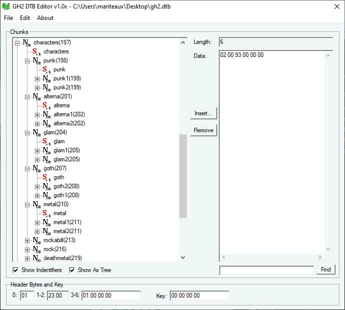 Here, you can see the characters array in gh2.dta, which defines all the available character shortnames and which outfits they can use. deathmetal2 is an array inside the deathmetal array, which is an array inside the characters array.
