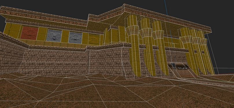 This one was just one of my map scraps, not intended for much of anything. I love the desert textures and I wanted to use them. I still think this one looks pretty great with the very dusty and suffocating orange fog and the imposingness of it, but I abandoned it after building an inside room of the tomb.
