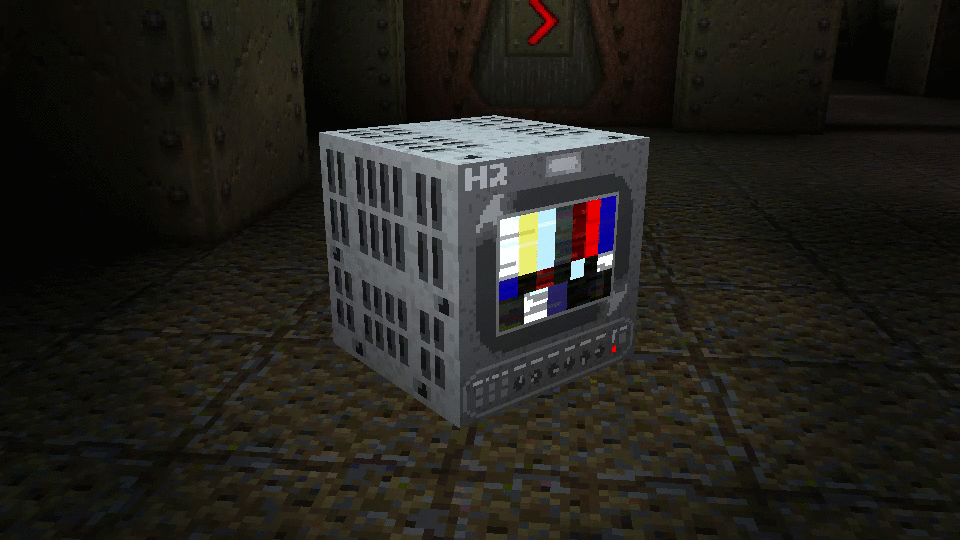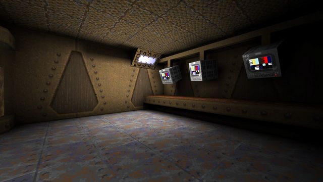This level actually contains my first two attempts at making textures from scratch! Quake didn't have much in the way of "prop" textures by default, and I wanted some more in the way of "base" stuff. In total, I built a blinking power button (which I still think looks pretty ace, even glowing in the dark) and a security monitor, also glowing and glitchy with static to boot. Think it was based on a real Sony monitor, but I can't remember which one a Sony PVM-8045Q. (The monitor texture was actually built for MXDM1 below, for what it's worth.)