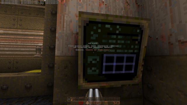 After some attempts at adding off-limits areas for decorative purposes (for "depth" reasons and to make the base seem bigger), this one got dropped. I did return to it briefly after I retooled Episode A into more of a cut Quake content mod (you can see id's unused boots model in the shot below, which I implemented as jump boots in QuakeC, and there was code for a proper healing pool too), but I never finished any of it, and the boots and code are now lost, most likely.
