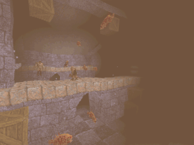 "The Kuras Stronghold" became the far more experimental of the two levels, revolving around getting three keys in three gauntlets each homaging a different favorite trap of NewHouse's, spikeshooters, crushers, and enchanted floating boxes over voids (maybe that last one's just one of my favorites). There'd be no combat in any gauntlet aside from an optional hidden passage where you could use the traps against the monsters. Once you were done gathering the keys, you could ascend the final staircase to the battle arena, the end of which teleports you into a gold-textured rocky section that was meant to provide a jumping off point for the sequel episode to Blue (though I'm not sure of NewHouse's intentions on that now). This new ending came in the round of polish in November; the original ending is lost to time and sucked anyway.