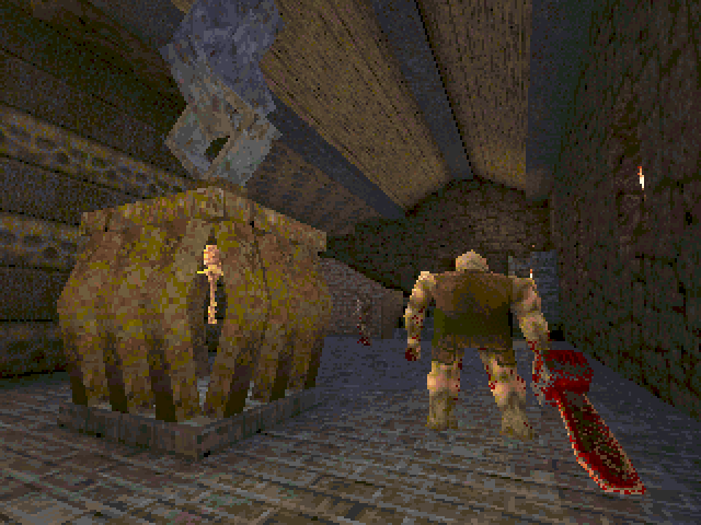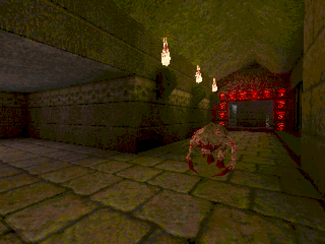 Honestly, looking back on it, it's a pretty meek and naive level. I built in this fork right at the start that gave people a "choice", but it mostly amounted to an extra hallway and two extra guns. I imagined this big run up a staircase and over a lava cavern at the end, and yet the lava cavern is literally just a corner you re-enter the (randomly built) top level of the temple through. The scale is pretty modest too, and (owing to my lack of knowledge of the engine), several of the enemies in the water cavern and in the final rooms are stuck in the floor and can't move.