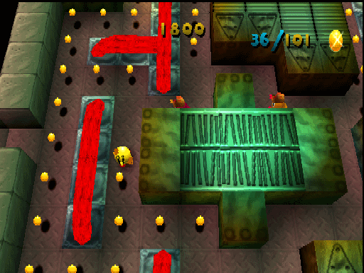 Pac-Man has to (and I do mean has to, as the game rudely reminds you should to get to the final boss without them) rescue six of his friends from the clutches of Toc-Man, scattering them across six lands from ruins to space to weirdass, spinning funhouse levels. These levels are nicely varied, not all that long, let you save often, and provide ample opportunities for bonus lives, thankfully. Mazes are naturally built into the levels and provided as optional extras for finding Galaxians in levels, but the ghost AI and occupational hazards of some of the later mazes make them a headache, especially when you're trying to conserve lives for the actual quest portion.
